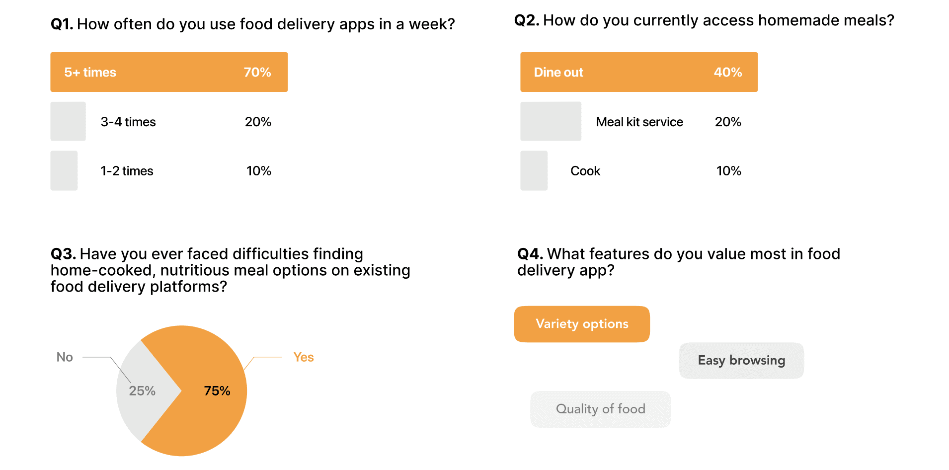 While food delivery apps are convenient, many users mentioned that finding healthy, home-cooked meal options is still difficult. To better understand how people actually manage their meals and where the real pain points are, I conducted a user survey.