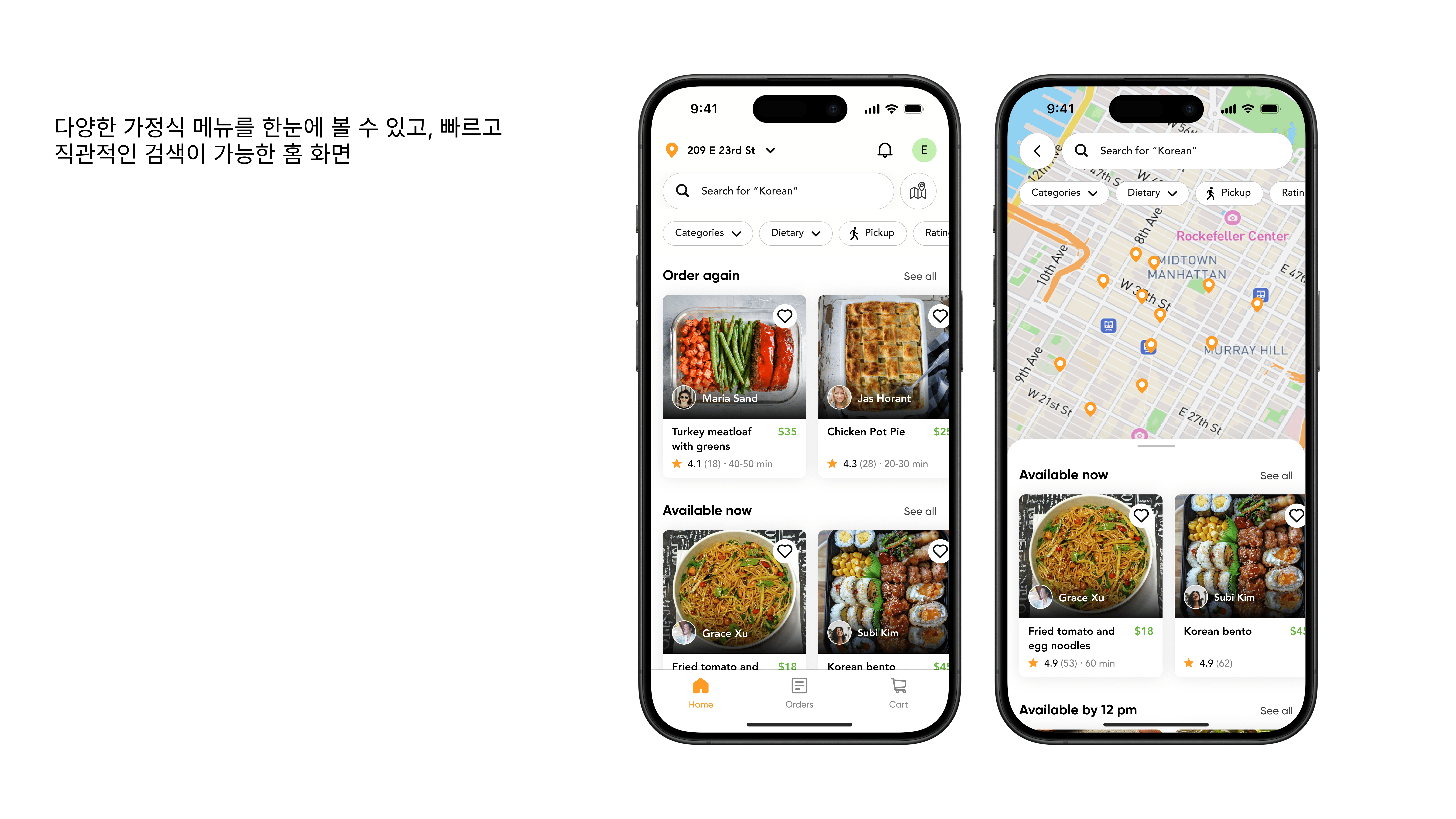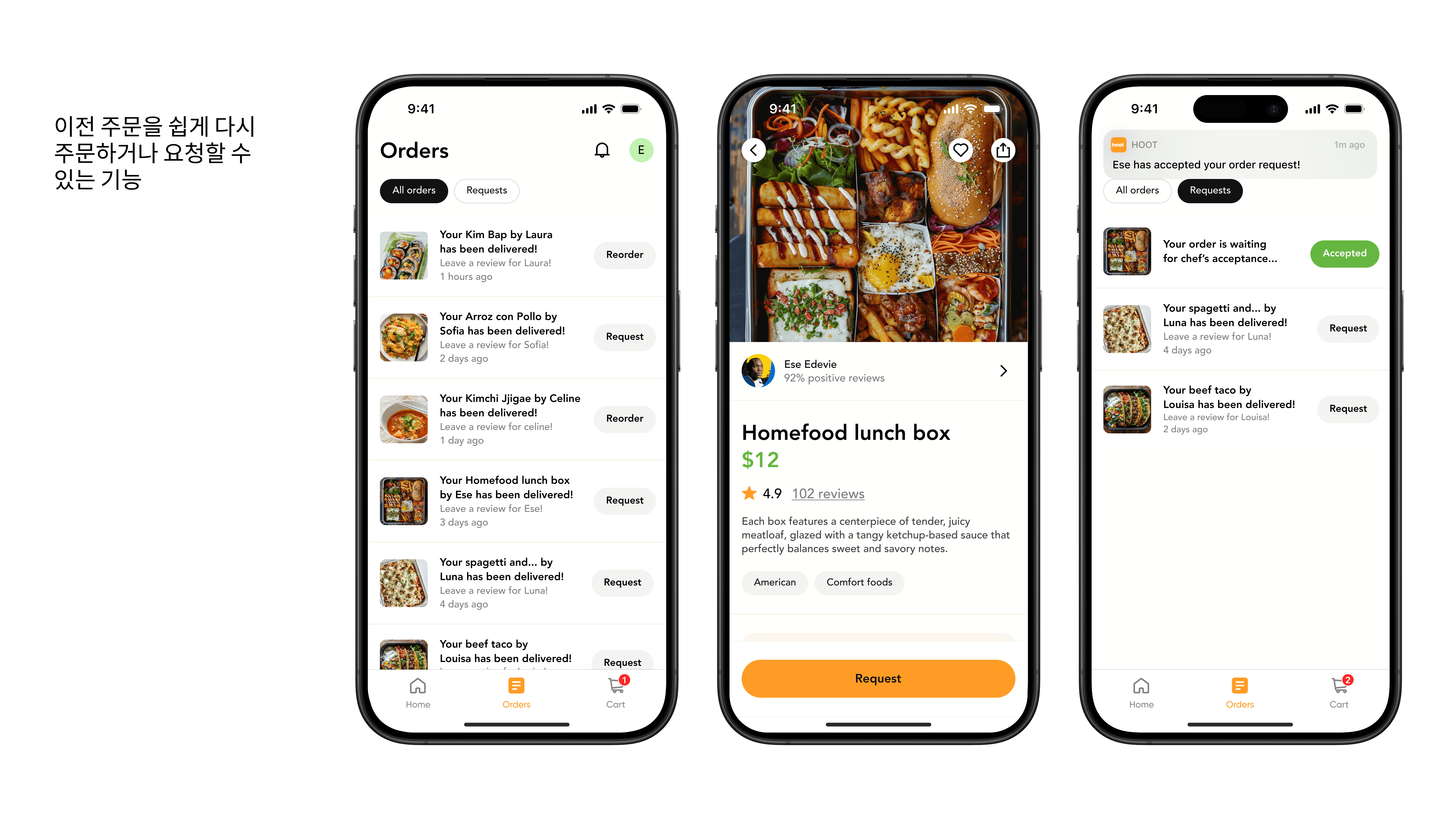 Hoot은 가정식 요리(Home cooked foods)와 푸드 딜리버리(Food delivery)의 중간 지점을 연결하는 서비스입니다. 로컬 셰프의 진짜 요리를 집 앞까지 편리하게 받아볼 수 있도록, 신뢰 기반의 주문 환경을 구축했습니다.