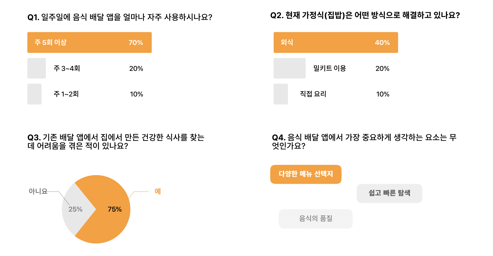 기존 배달 앱이 편리하긴 하지만, 집에서 만든 건강한 식사를 찾기에는 여전히 불편하다는 이야기를 자주 들었습니다. 사용자들이 실제로 어떤 방식으로 식사를 해결하고 있고, 어디에서 불편함을 느끼는지 명확히 이해하기 위해 설문조사를 진행했습니다.