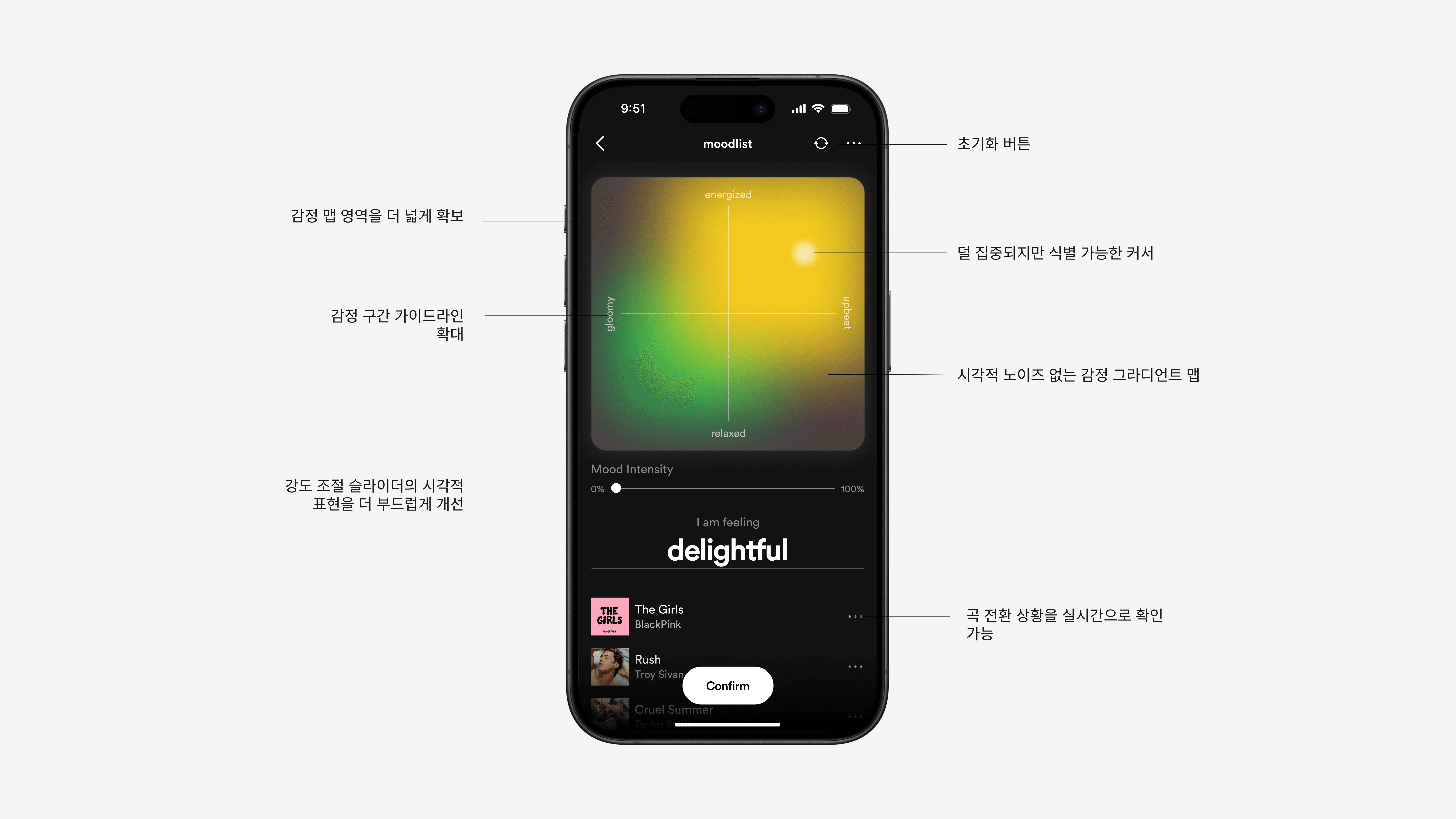 감정 지도를 더 명확히 이해할 수 있도록, 각 축의 의미를 크고 명확하게 시각화하여 가독성과 직관성 향상했습니다.'Mood Intensity' 기능 추가