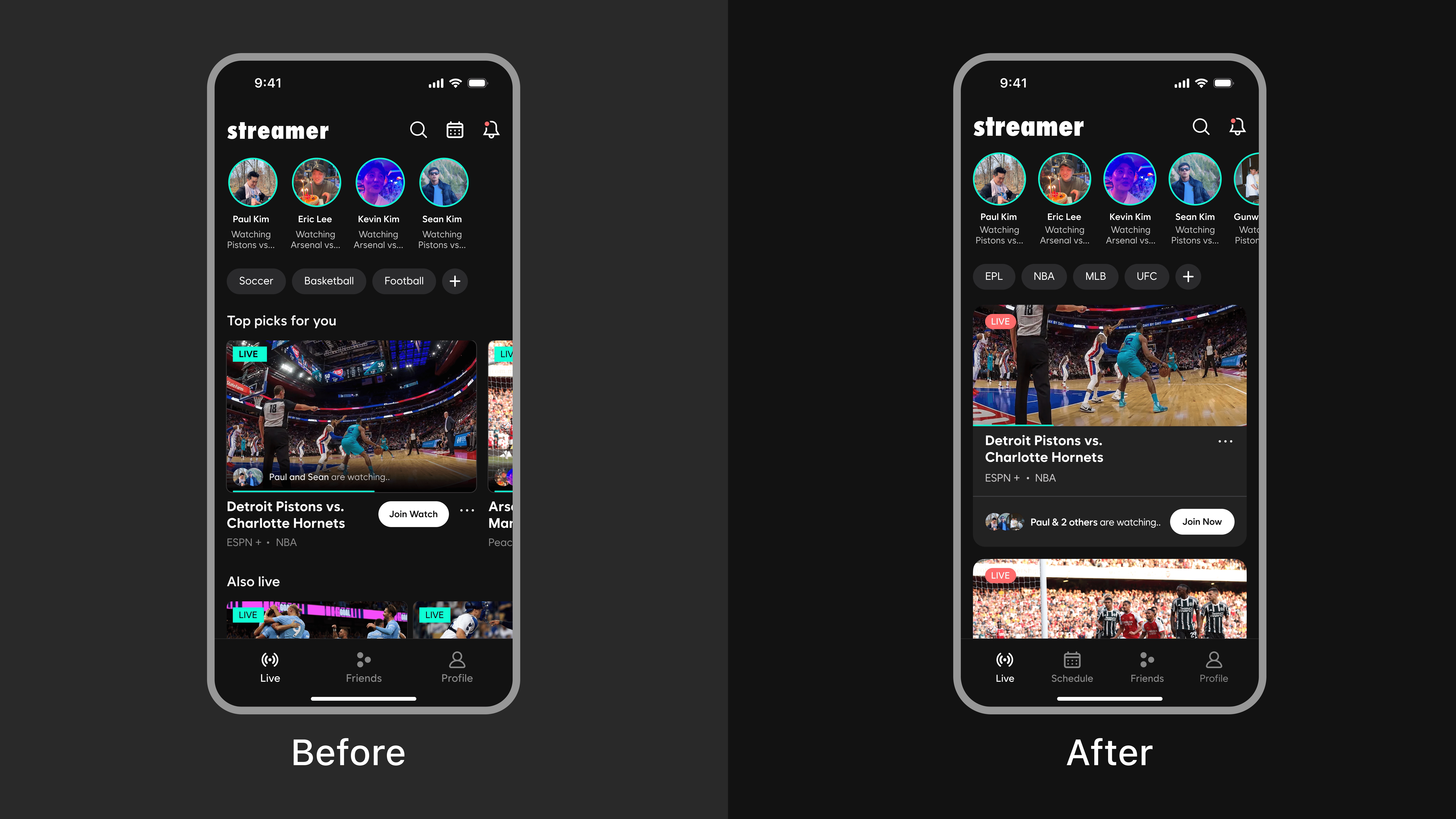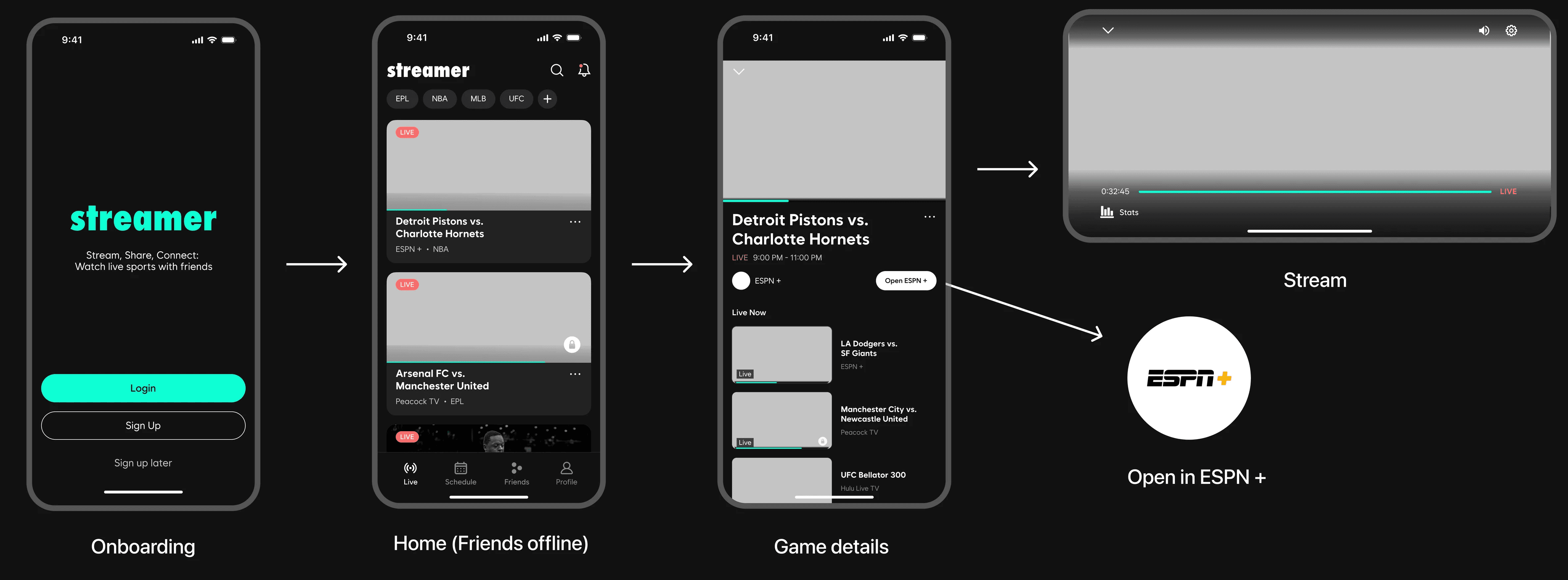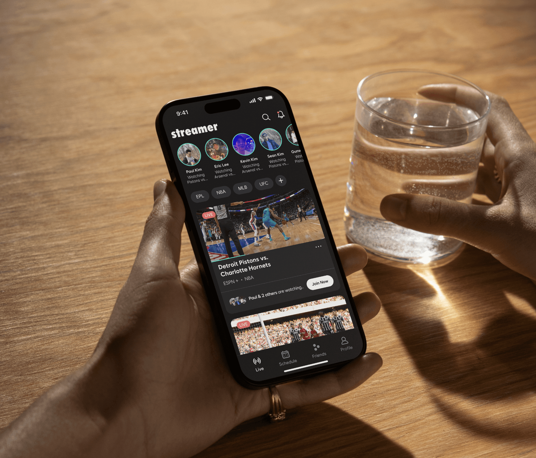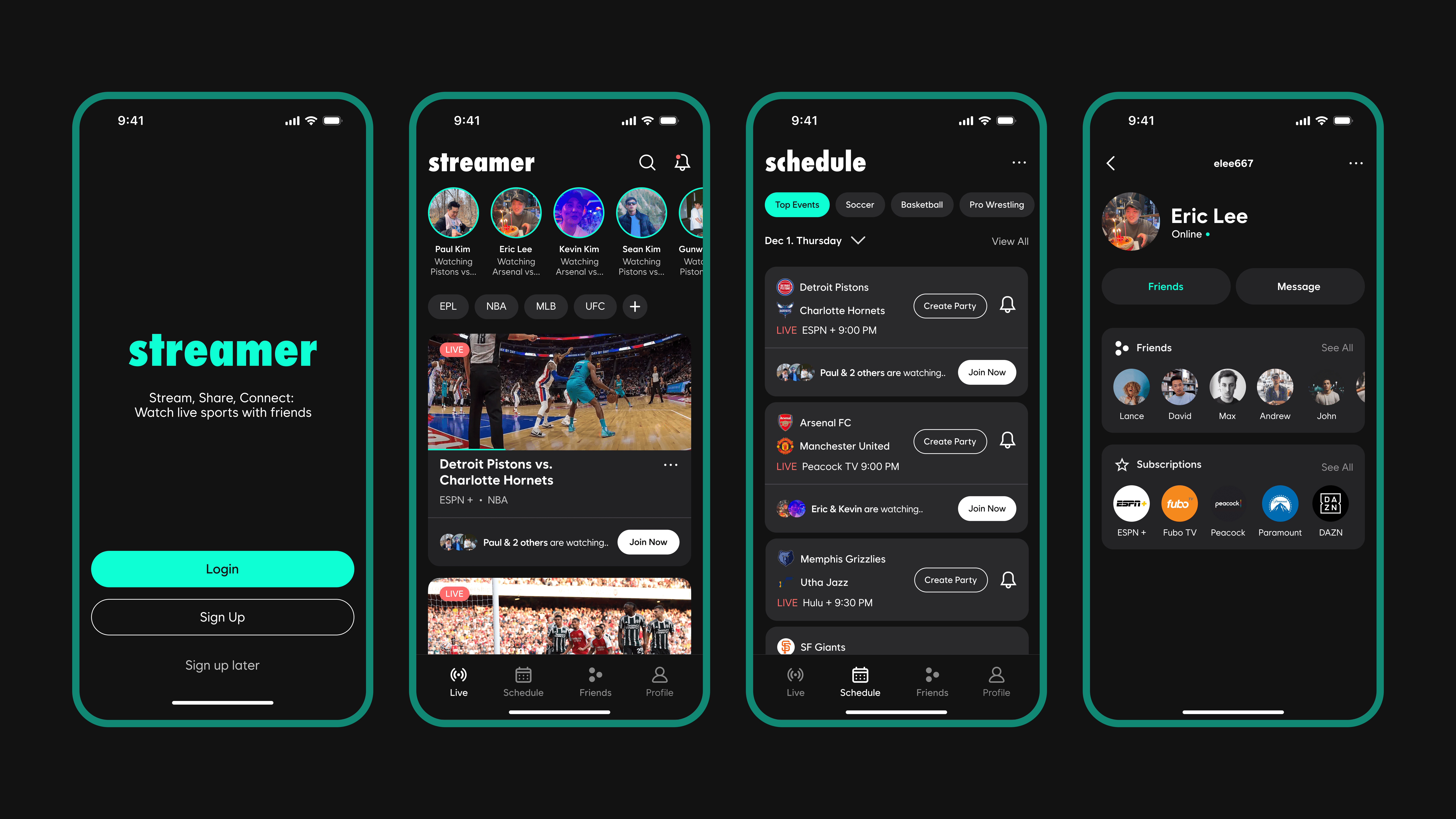 A mobile app that allows fans/friends to enjoy live sports together, connecting streaming services into one platform for shared viewing.