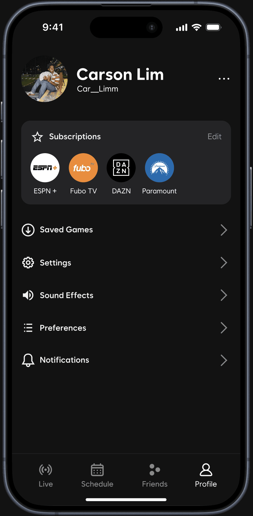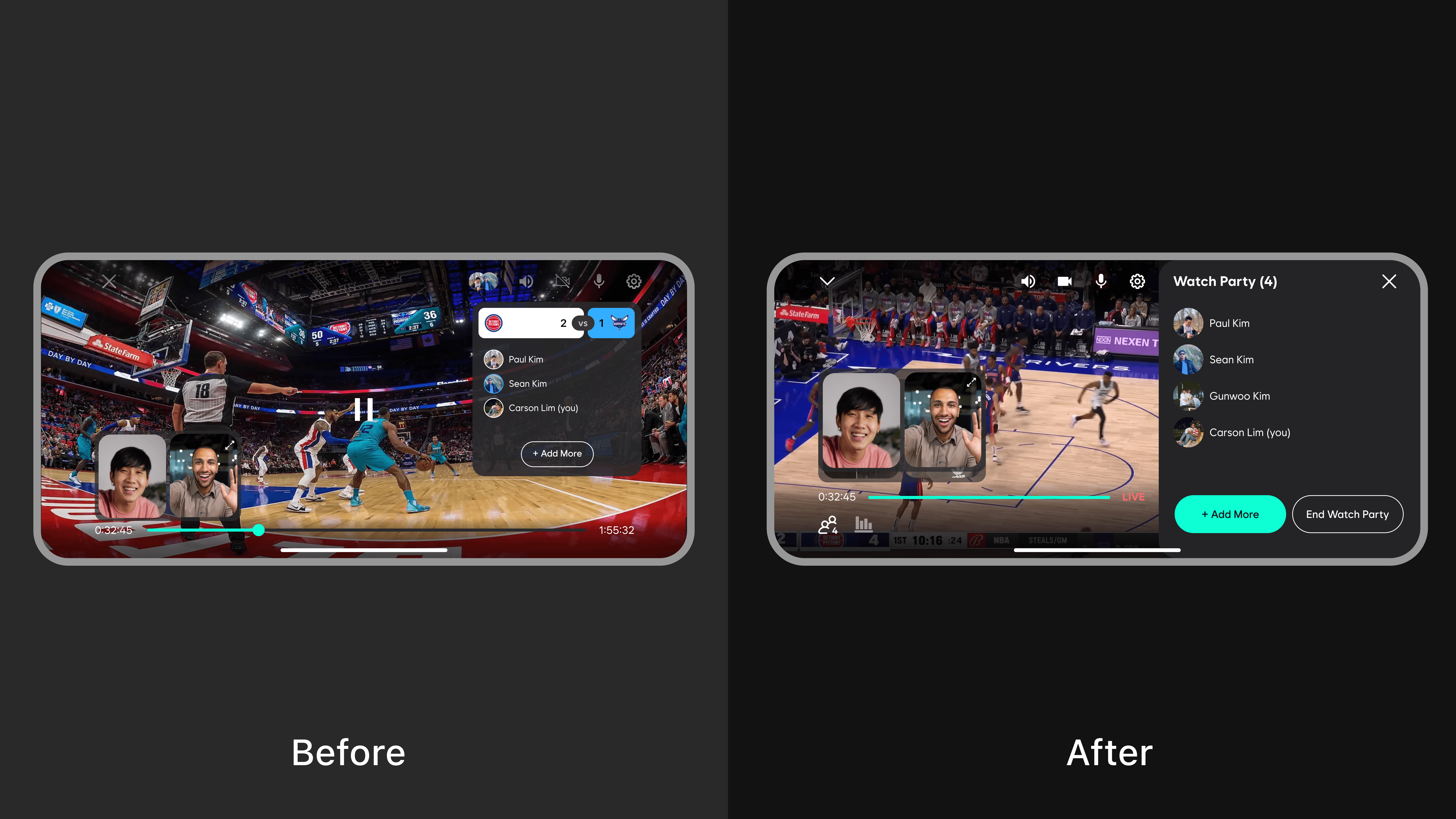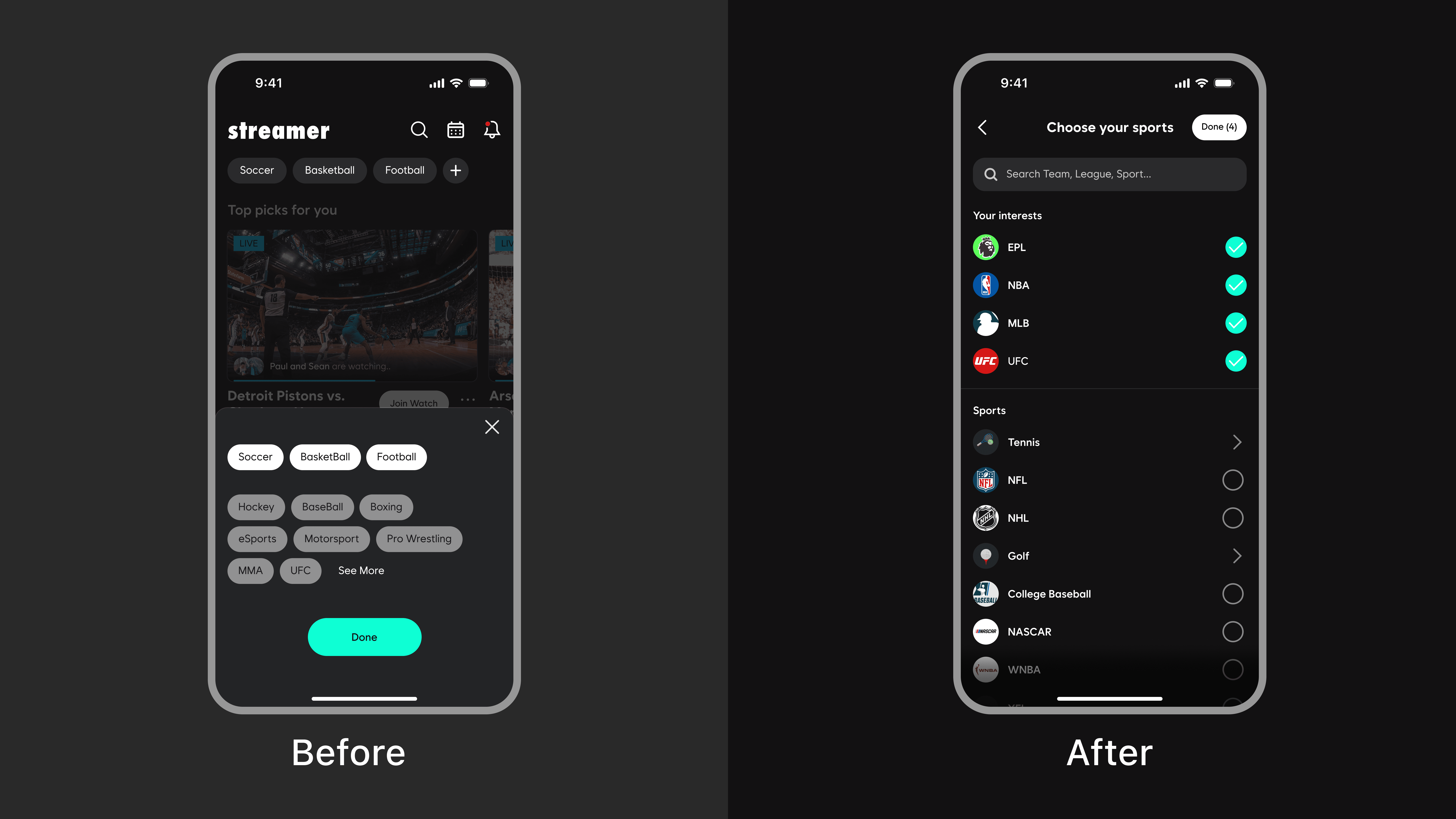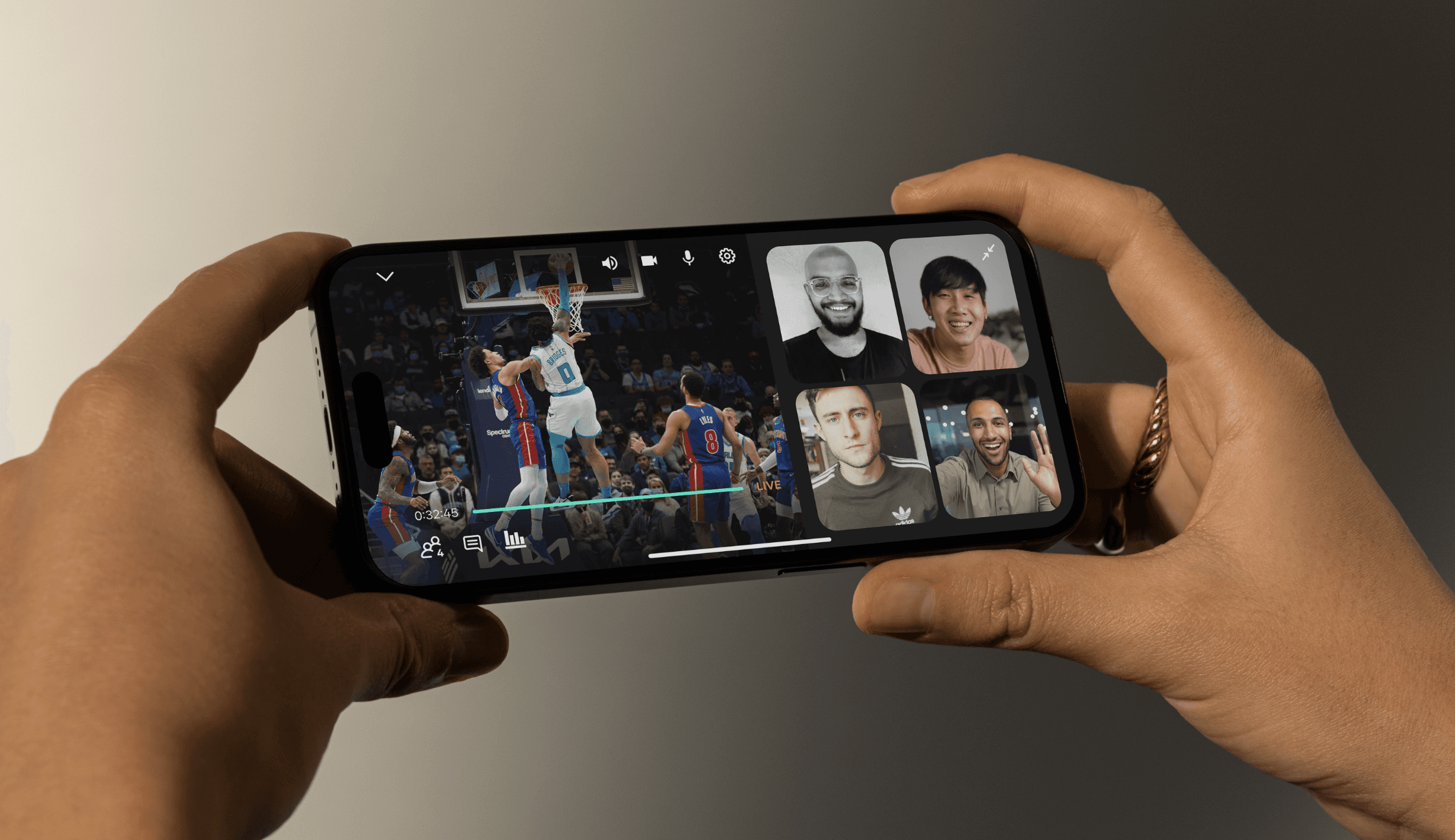 A mobile app that allows fans/friends to enjoy live sports together, connecting streaming services into one platform for shared viewing.