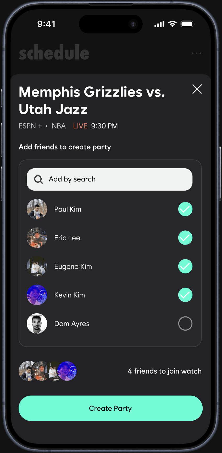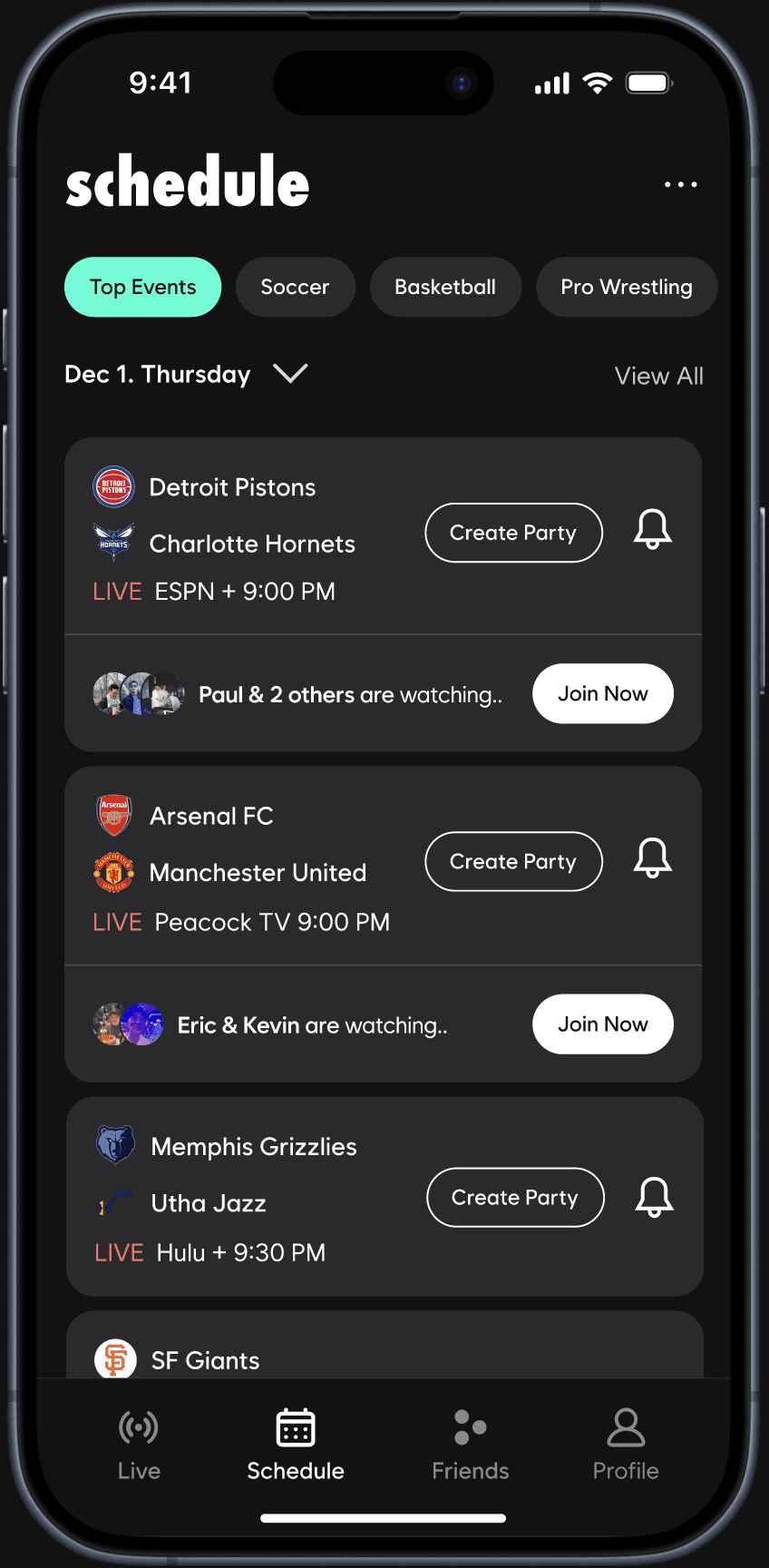 Highlight the watch party features below the time of the game.